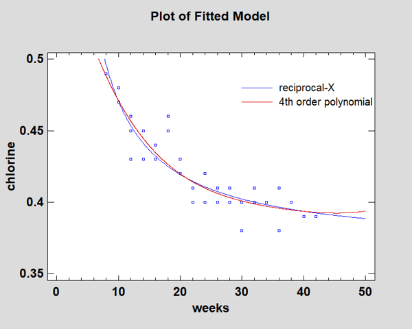 In fact, if we overlay the Reciprocal-X model and the fourth-order polynomial in the StatGallery, the predictions are very similar throughout the range of the data: